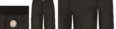 - Two button-thru, hex-style pockets with angled bartacks, bartacked pencil stall on left pocket