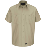 Dickiesr Adult 5.25 ounce Short Sleeve Work Shirt. Wrangler Adult 5.25 Ounce Long Sleeve Work Shirt. 5.25 ounce 60/40 cotton/poly soil-release, wrinkle-resistant, wickable color-retention fabric. Straight bottom hem with side vents. Left chest pocket with pencil stall. Banded collar with permanent stays. Expanding back side pleats and seamless underarm gussets for wide mobility. Style Ships From El Dorado Springs, MO. From March to December 2019, these styles will transition from Wrangler to Dickies labels. Product may be shipped as mixed labels during this time